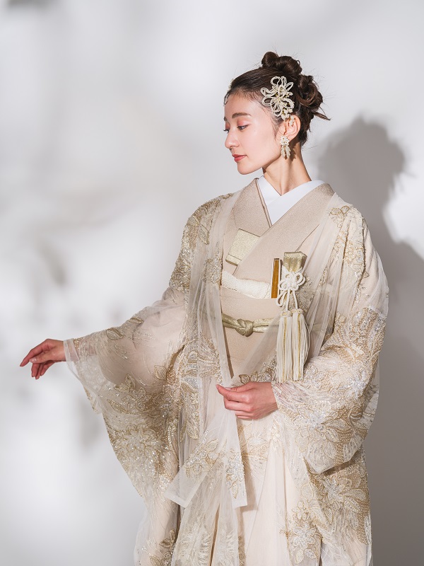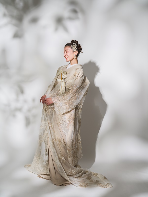 ゴールドとホワイトの大柄ビージングレースをあしらった一着 インパクトある花柄の中にも優美さを兼ね備えており花嫁をより美しく見せてくれます 大柄なデザインは光がきれいに反射しより華やかさを際立たせます 豪華でありつつ繊細な煌めきを纏う上品な一枚です
