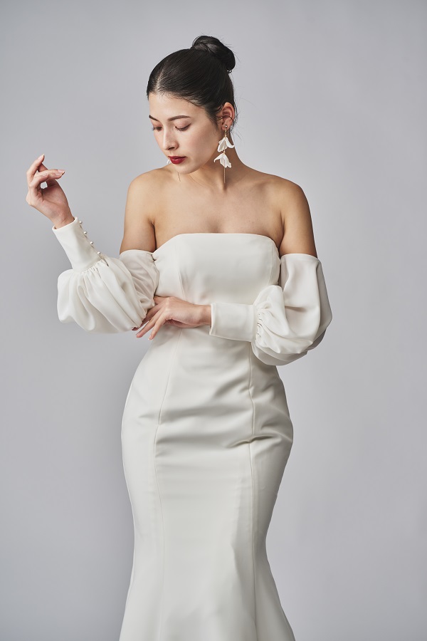 提灯を意味するランタンスリーブはオフショルダーになっており抜け感がありつつ たっぷりとしたボリューム感が洗練された雰囲気に