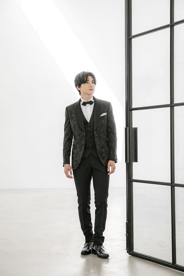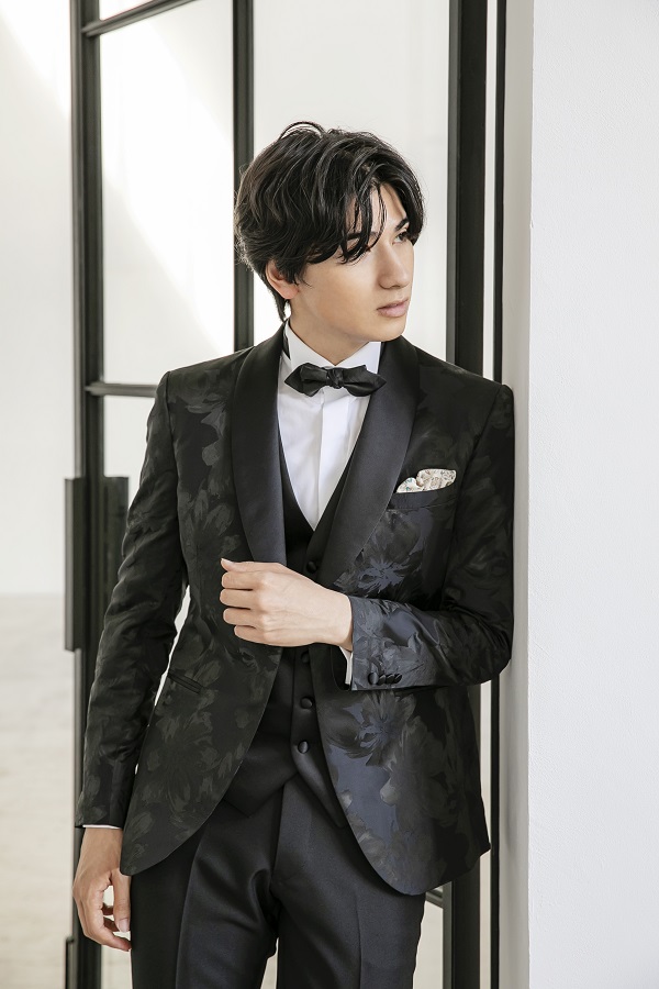 ジャケットに花柄のジャガード生地を用いたブラックタキシード