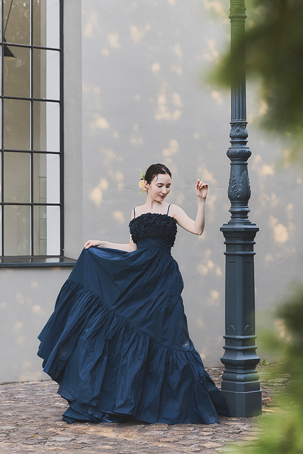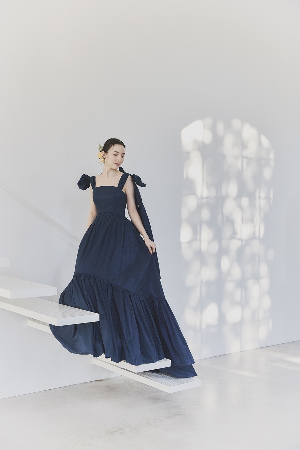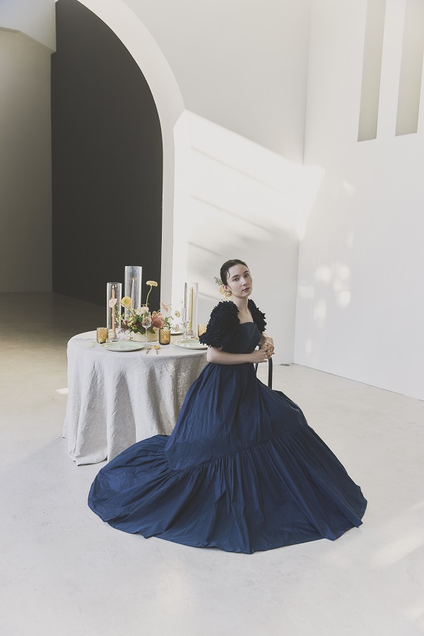 マテリアルにはタフタを使用し花嫁のさまざまな動きに合わせて エアリーにスカートが動き 濃い色味ながらも軽やかな印象を演出