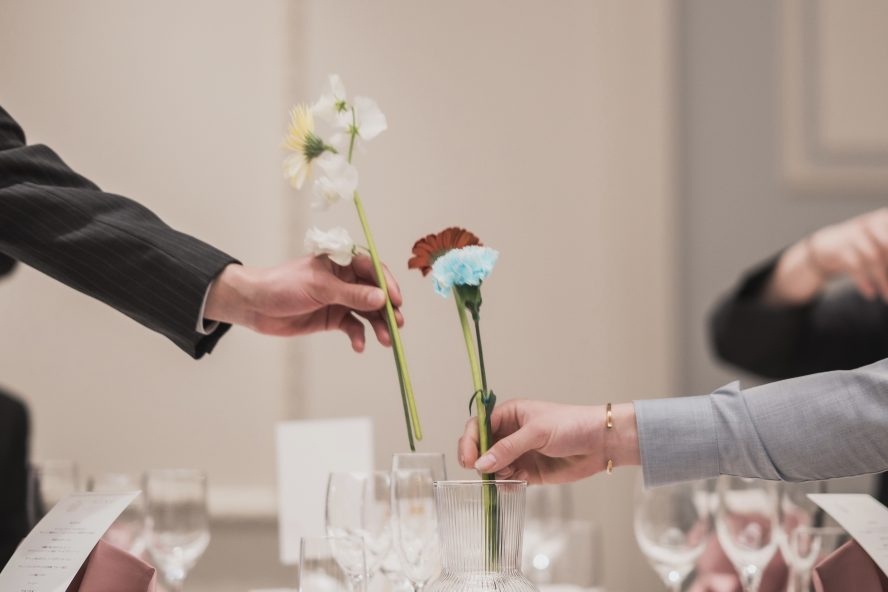 フラワーマーケットとは ゲストの皆様にお2人の誕生花のガーベラ1本とお好きな花1本の計2本受付で選んでいただき
